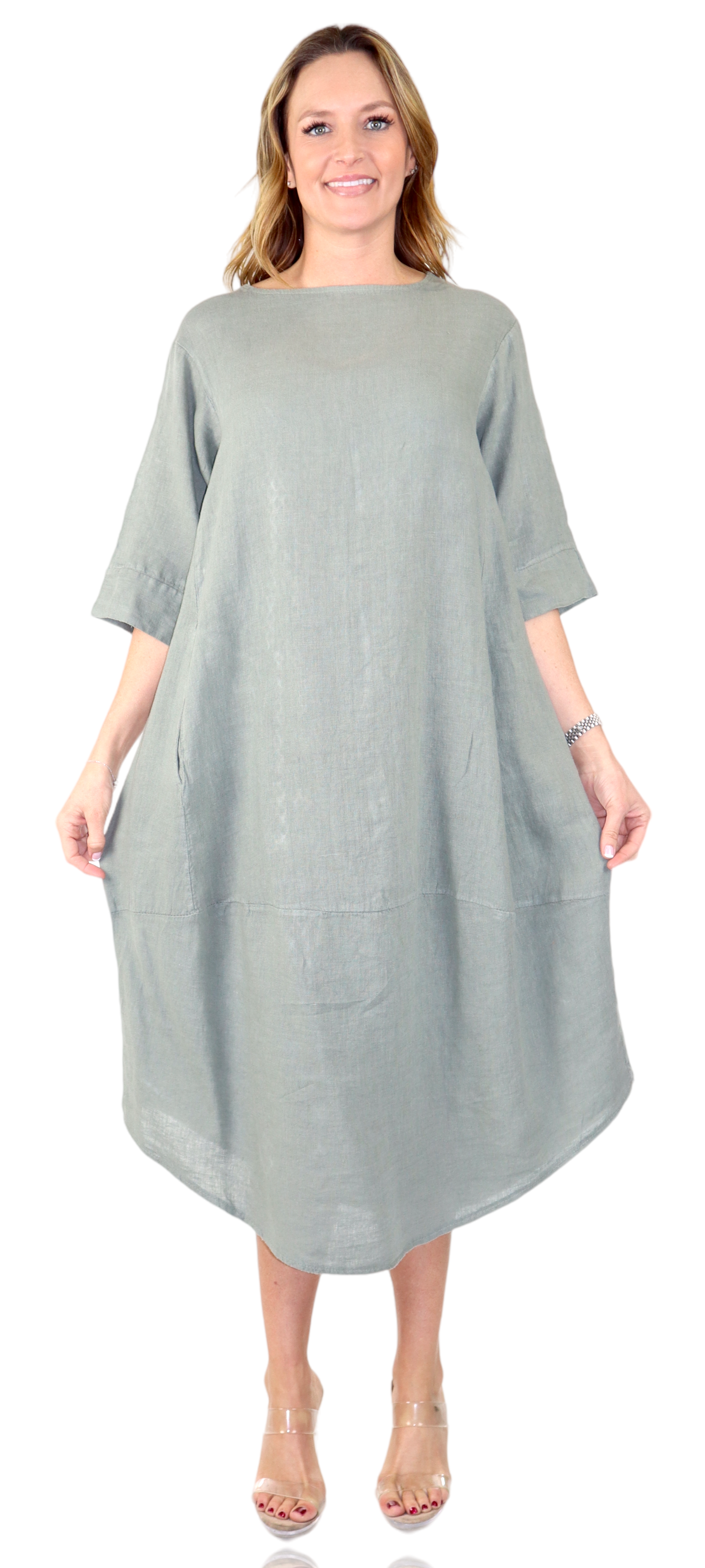 Womens 100% Pure Linen Breathable Boho Balloon Hem Dress w/ Side Pockets