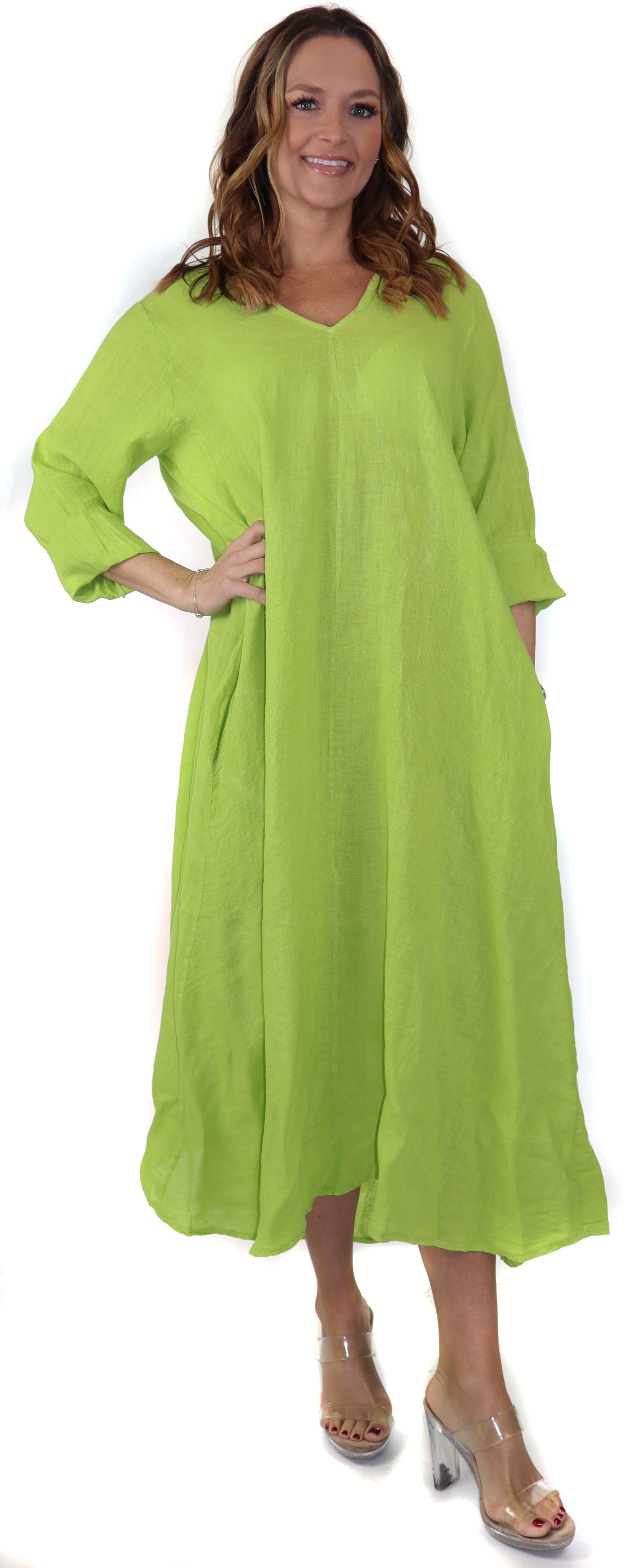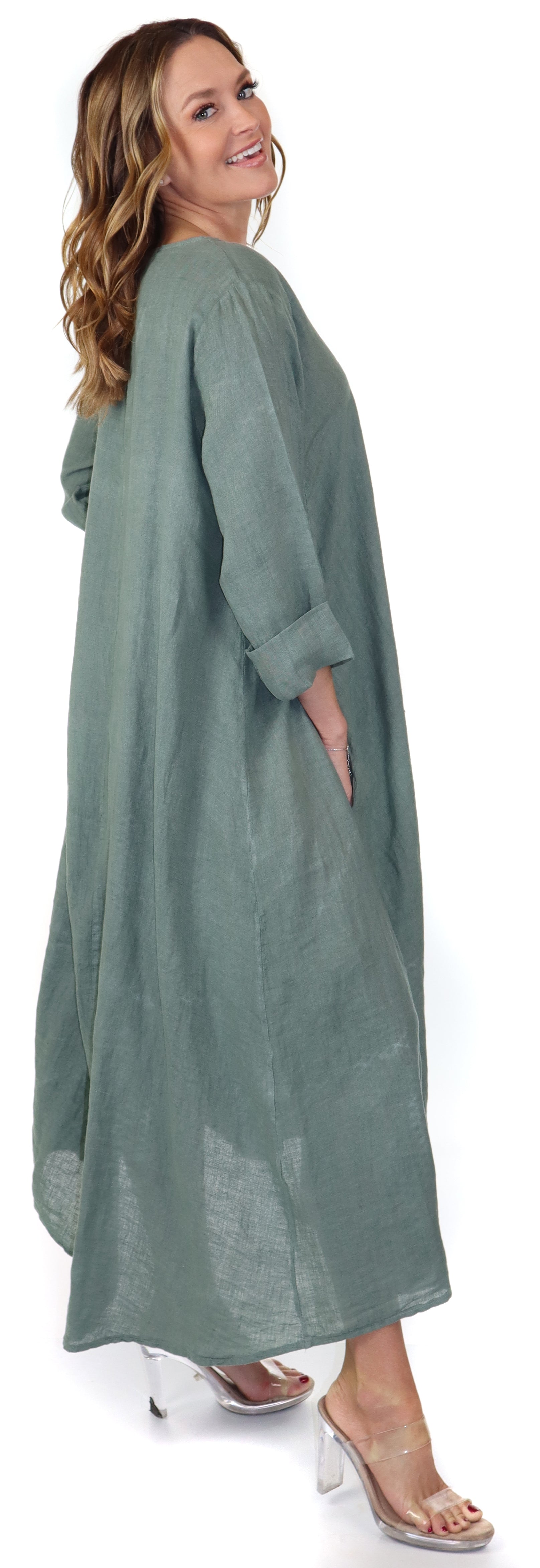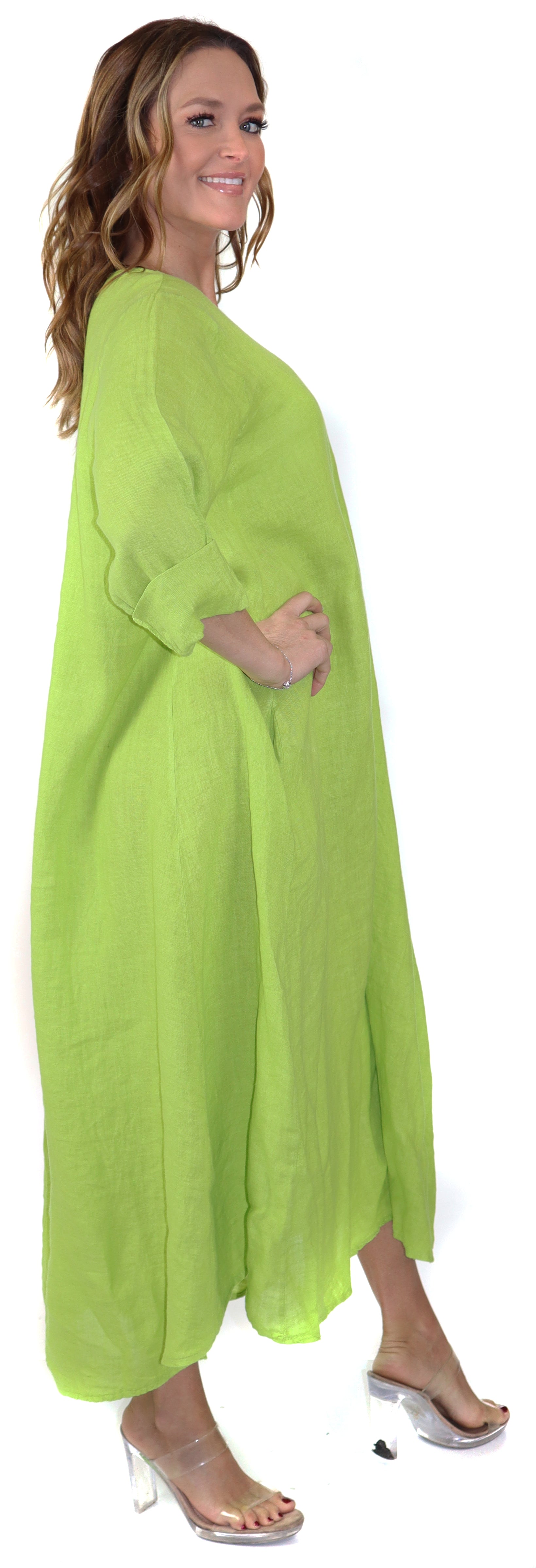- 100% Prewashed Linen. This is a full circle swing dress so the flowing bottom hides hips and has a slimming effect