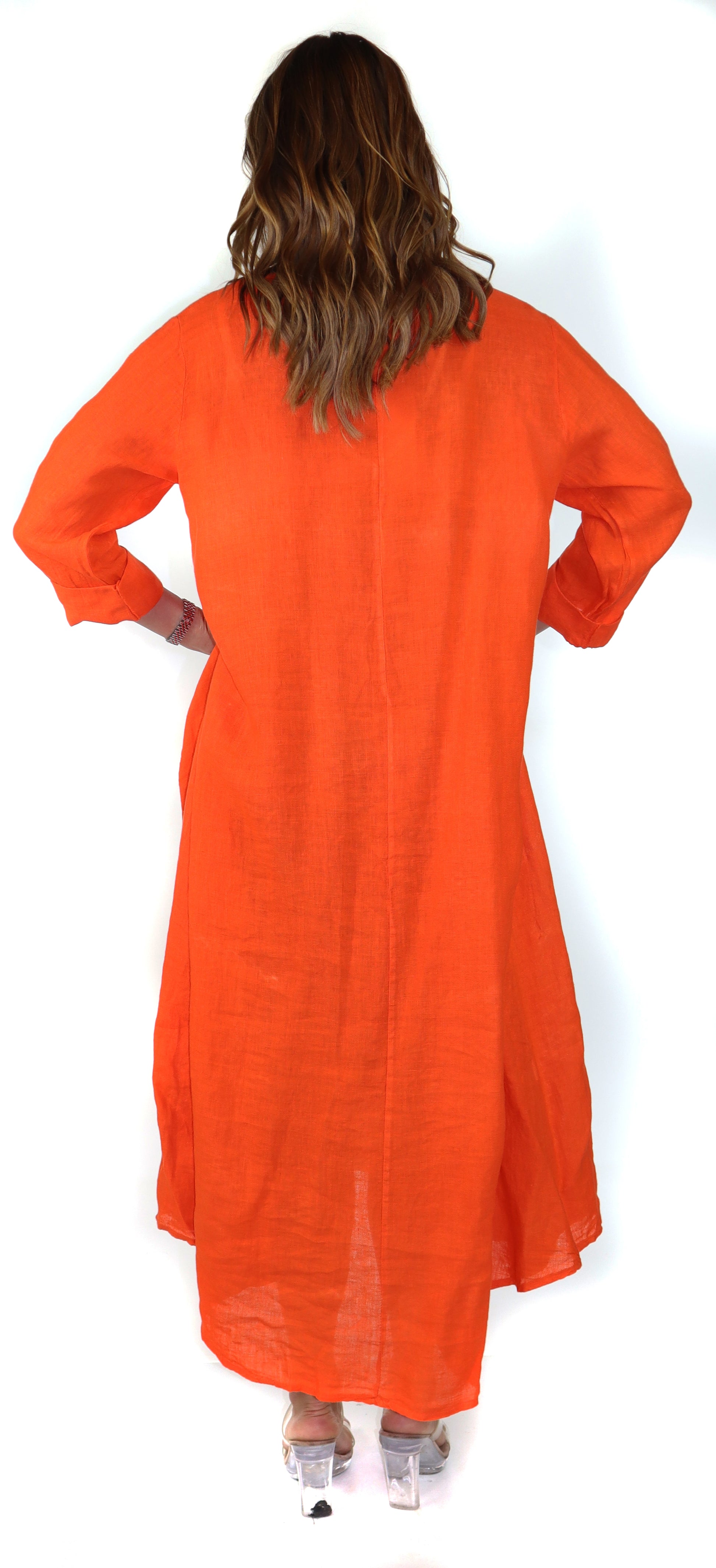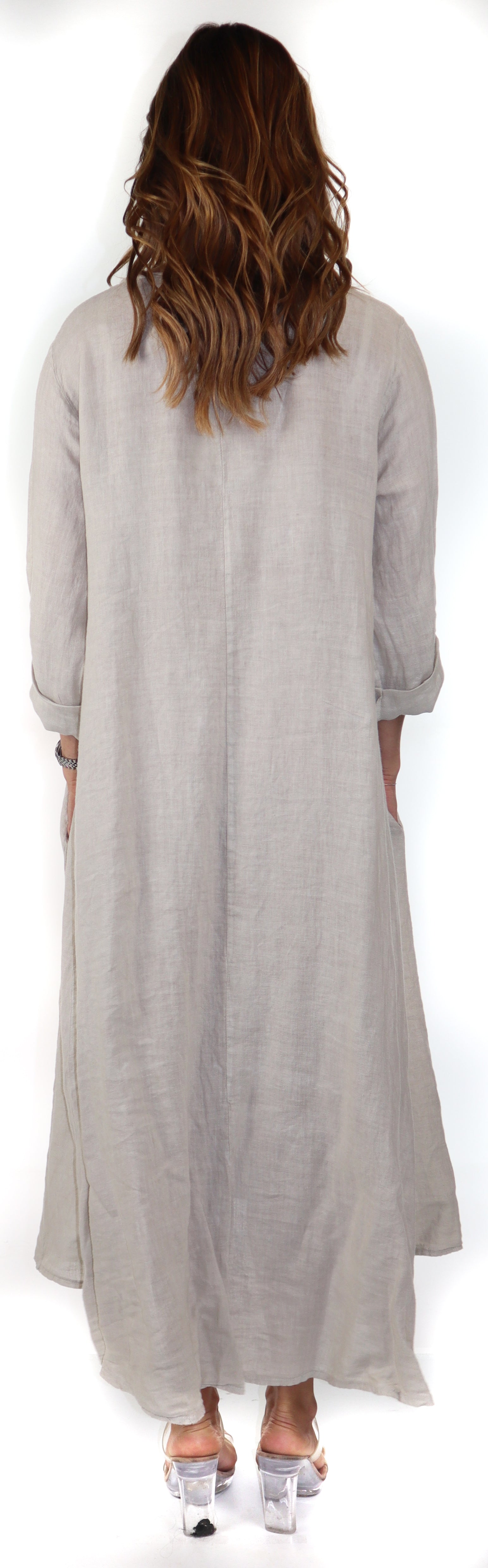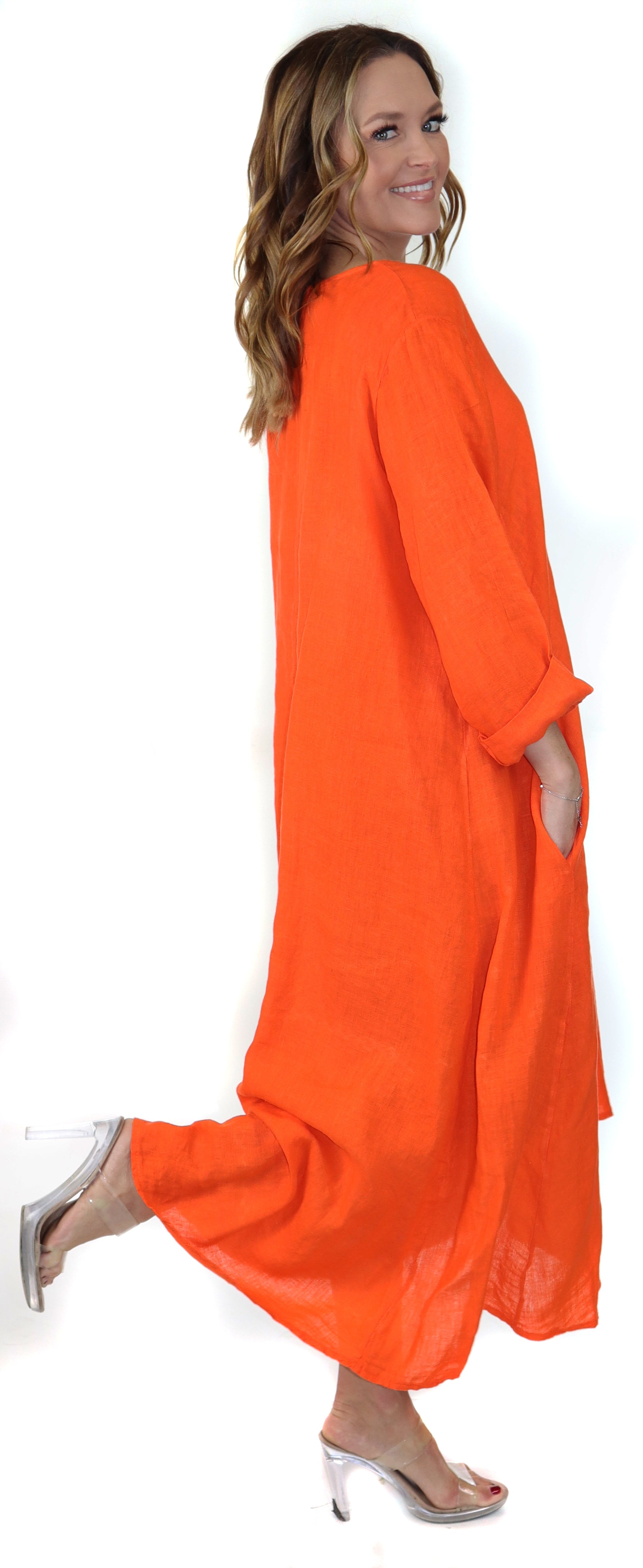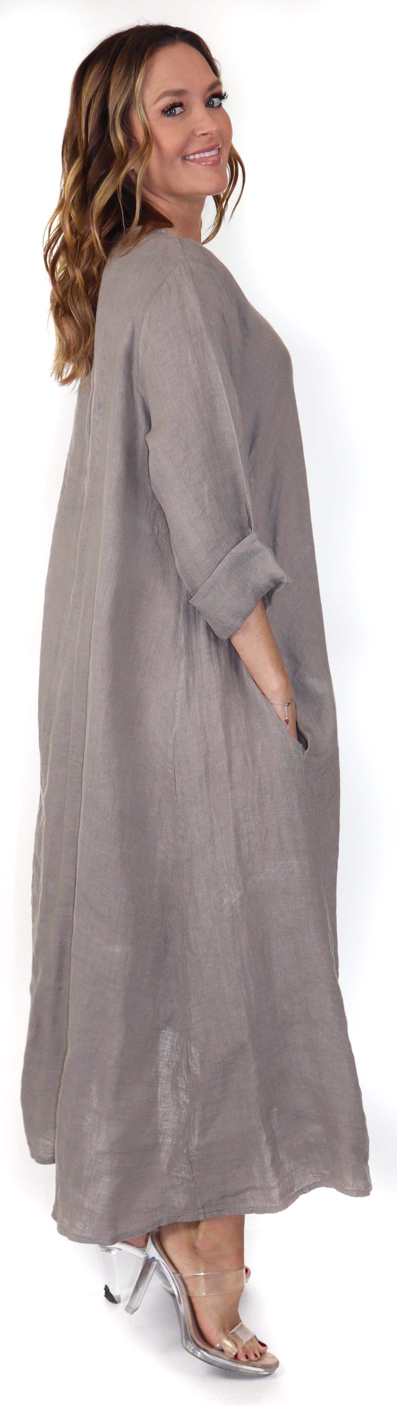 - 100% Prewashed Linen. This is a full circle swing dress so the flowing bottom hides hips and has a slimming effect